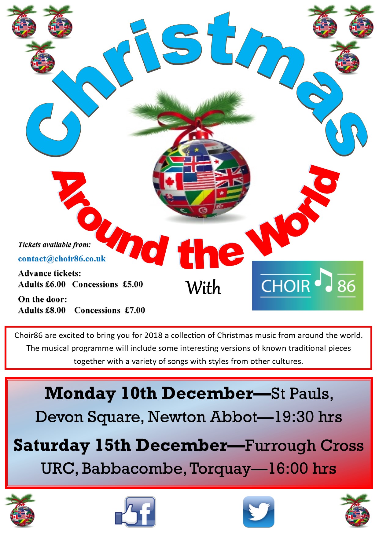 Due to circumstances beyond our control, it has been necessary to change the venue for our concert on Monday 10th December.   This will now take place at St Pauls Church, Devon Square, Newton Abbot.   Any tickets previously purchase will be honoured at the new venue.